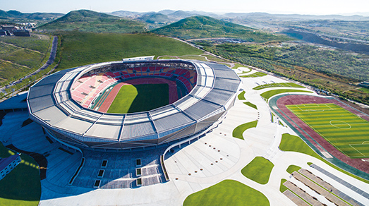 工程规划选址位于大连市金州区石河街道北海村与黄旗村交界处,总用地面积:234459m2;建筑面积:约60000m2,项目包括可容纳3万人的体育运动场主场一座及场外标准副场地一块和停车场、景观、绿化、道路、综合管网等附属项目。被评为“中国钢结构工程金奖”、“全国绿色示范工程”、“辽宁省优质主体结构工程”、“国家一类田径场地”。